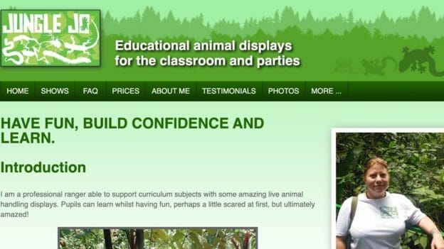 Joanne Frisby AKA Jungle Jo, who does live exotic animal birthday parties and educational displays for residential homes, people with disabilities, Scouts, brownies, Summer fetes, libraries, after school clubs. Jo teaches curriculum-based subjects using her own live animals in the classroom.