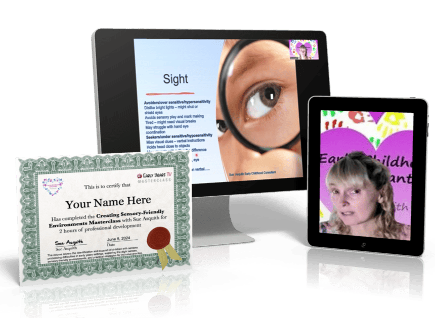 In this comprehensive masterclass on creating Sensory-Friendly Envionments, leading early years consultant Sue Asquith provides essential knowledge and practical strategies to help you understand sensory processing and how it affects young children’s behaviour, self-regulation and learning. You’ll discover how to identify signs of sensory processing difficulties and learn effective ways to make reasonable adjustments to your environment and routines to better support these children.