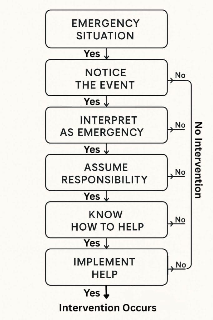 - Decision model framework: Helping requires progression through five sequential steps, noticing the event, interpreting it as an emergency, accepting personal responsibility, knowing how to help, and implementing the decision, with failure at any stage preventing intervention.